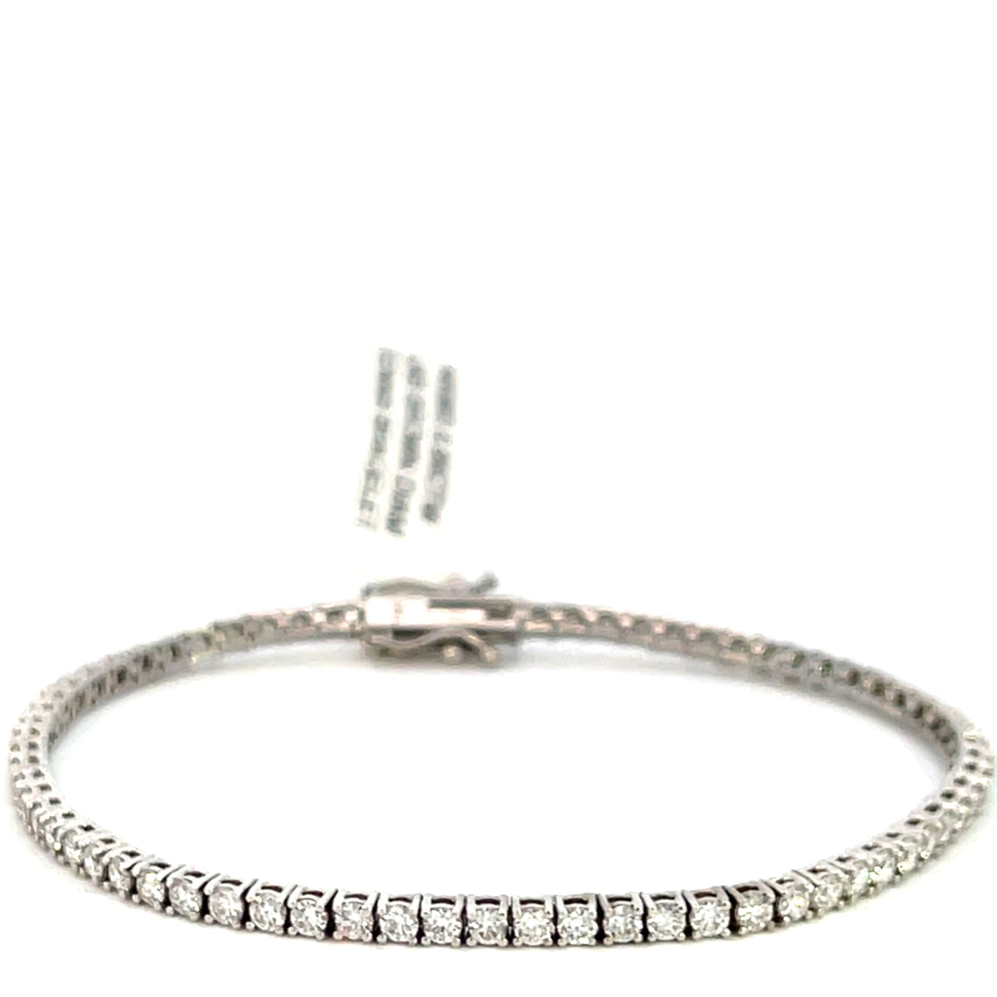 The 14K White Gold 2.26CTW Lab Grown Diamond Tennis Bracelet features lab-grown diamonds totaling 2.26 carats, set in 14K white gold. The diamonds are evenly spaced, creating a continuous line of sparkle around the wrist. Lab-grown diamonds offer the same brilliance and quality as natural diamonds but are more sustainable. This classic tennis bracelet design is elegant, timeless, and perfect for adding a touch of luxury to any outfit.